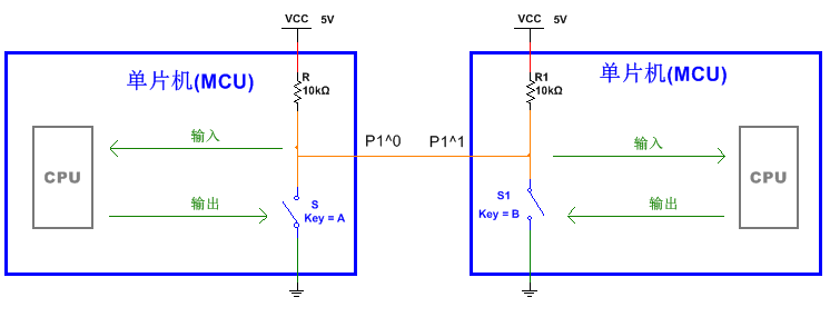 当设置两个IO口都输出低电平,即S和S1都闭合时,总体是低电平;而当设置其中一个IO口输出低电平另一个输出高电平时,即S或S1闭合,此时两个IO口上都会呈现低电平。只有当P1.0、P1.1都输出高电平,即S和S1都断开时,才会呈现高电平。