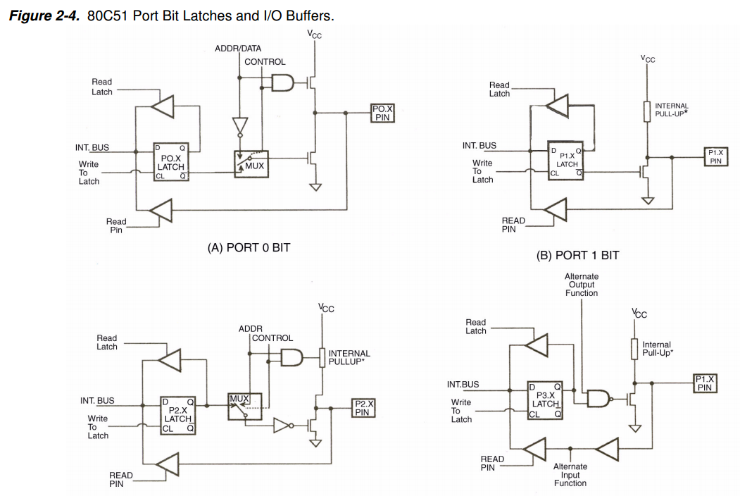 上图正是官方给出的权威的51单片机IO口结构图。可以看出,单片机的四组IO口内部结构各不相同,原因是有些IO口有第二功能,入门篇里面提到过。