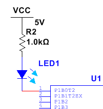 电路关键部分如下,VCC通过1k电阻连接到LED正极,LED负极接到P1.0口: