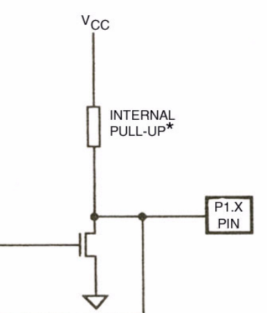 图中的R为阻值10k的上拉电阻,S是由前面的晶体管等效的电子开关。蓝色框中的部分在单片机内部。