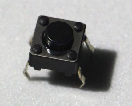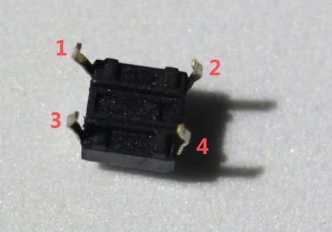 讲第二个实验前,先简单介绍下常用的按键开关。下图就是最常见的按键开关,有四个引脚,图中的1、2连在一起,3、4连接在一起。按下按键时,四个引脚就全部导通了。