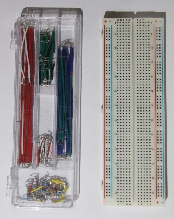 下图展示了面包板线和一种常用的面包板。面包板线可以用粗细合适的普通硬导线,也可以使用图中所示的专用线,会更方便。