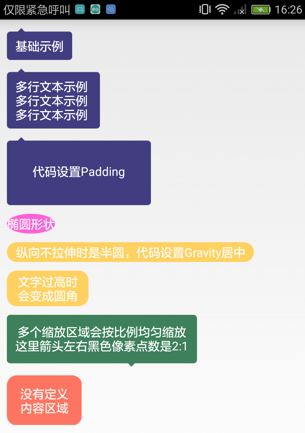 下面有几个示例,NinePatch切图,以及实际显示效果如下。