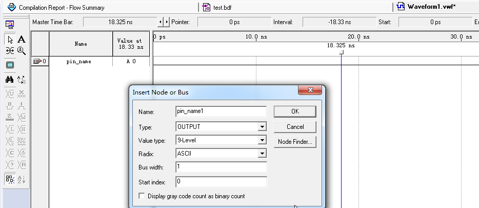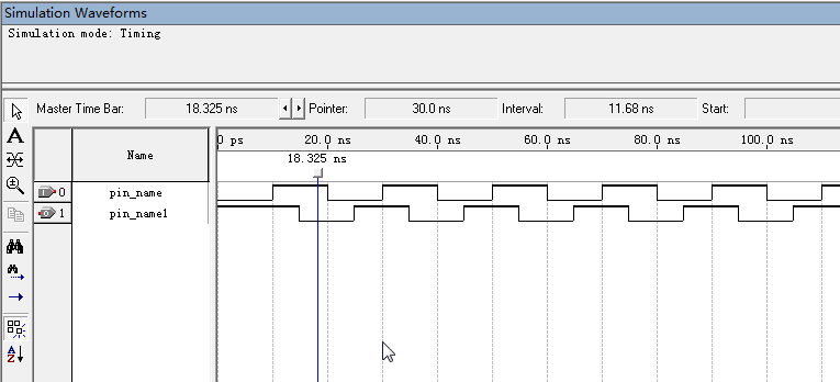 保存好仿真文件,就可以点蓝色三角按钮仿真。仿真结果如下,电路中的非门有10ns左右的延迟。