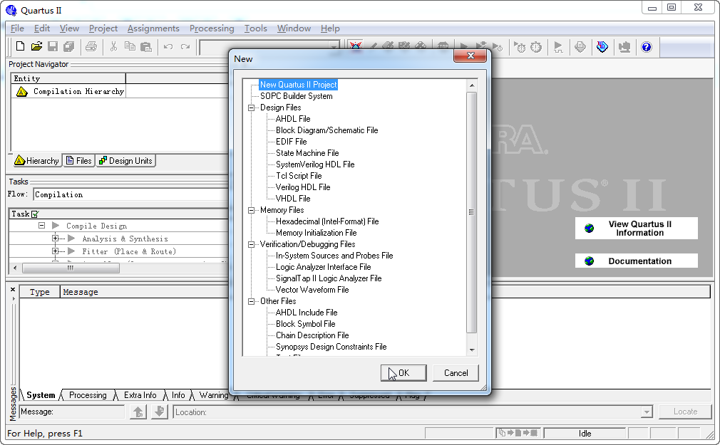 菜单File-New,可选择设计文件:Block Diagram/Schematic File(框图/电路图) / VHDL File / Verilog HDL File …,仿真文件:Vector Waveform File 等。