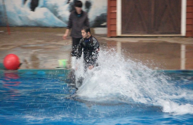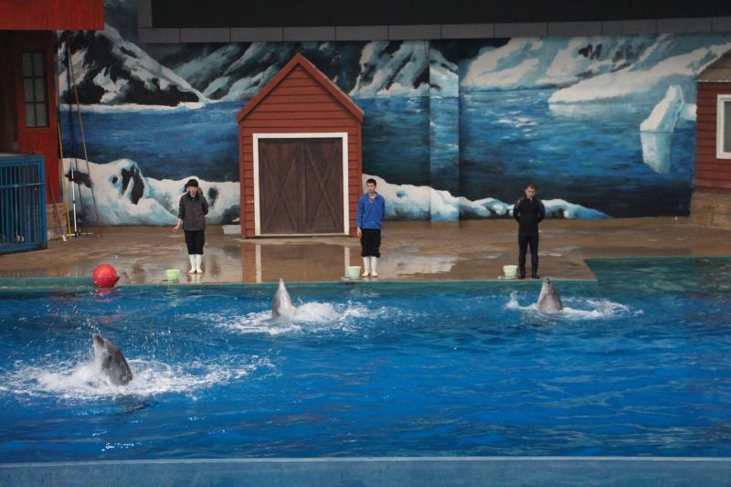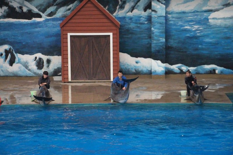三只海豚上岸和三只驯兽师互动~哦,不对,是三位驯兽师……