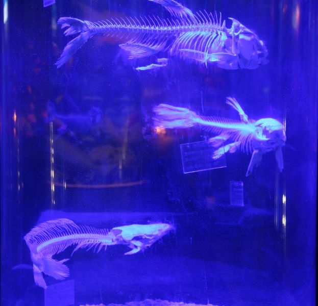 往里走有几根充满水的柱子,里面是鱼骨模型