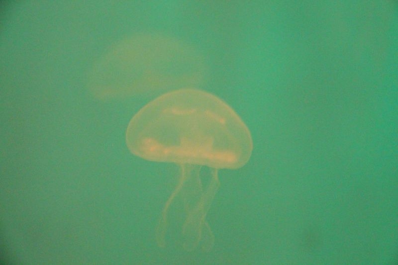 水母的颜色很浅,几乎是透明的,在彩色的灯光下很好看~