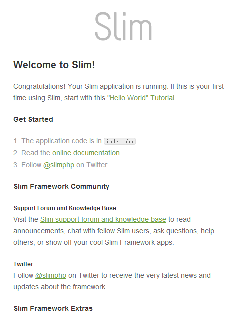 启动服务器,输入如下网址可进入Slim欢迎界面 http://localhost/libs