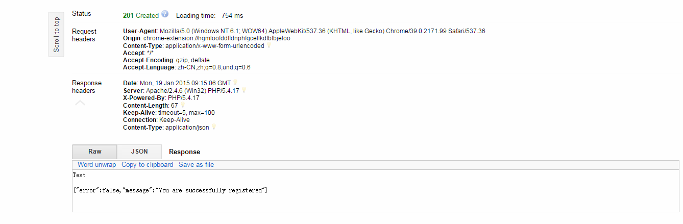 根据参考文章中的内容,这里测试register的API,其他API的测试方法一样。启动Chrome的插件Advanced Rest Client,填写相关数据。其中API的网址如下,在Payload中添加字段name,email,password,选择POST方法;最后点击Send按钮,即可发送数据到服务器端。