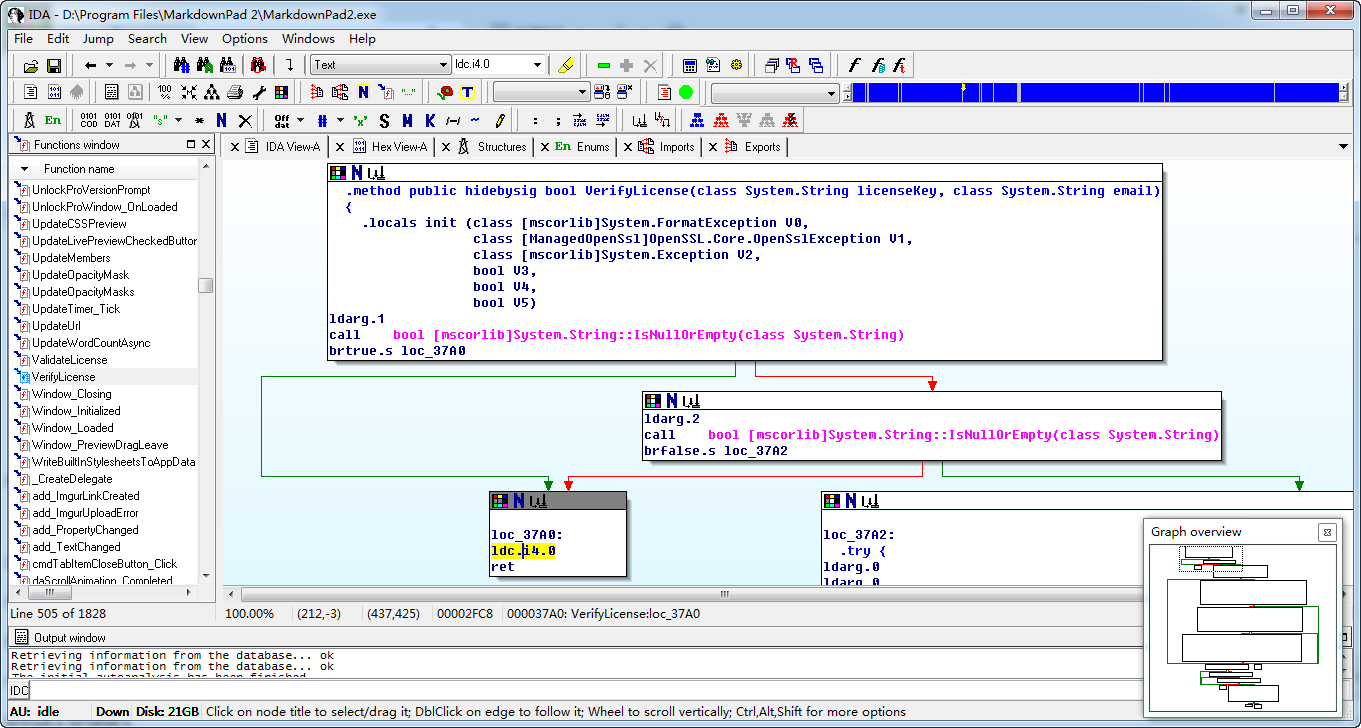用十六进制编辑器修改exe文件,就修改了IL指令,相当于改动了源码。按原文说明,在IDA View-A中单击选中图中的ldc.i4.0,这句IL指令与ret组合起来,相当于return false,从流程图中可以分析出,对应了C#源码中VerifyLicense函数的第一个return false。
