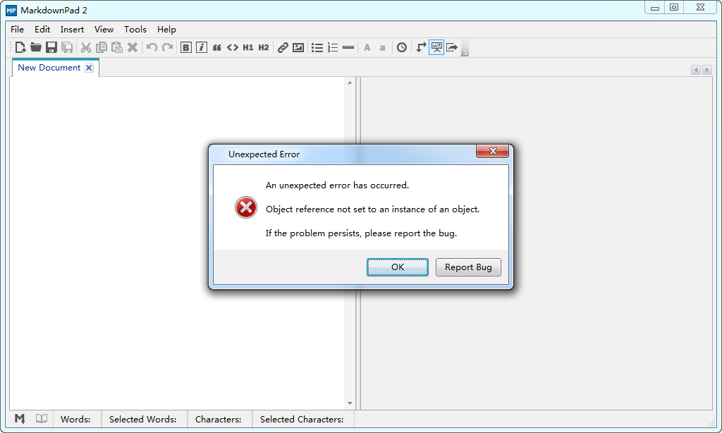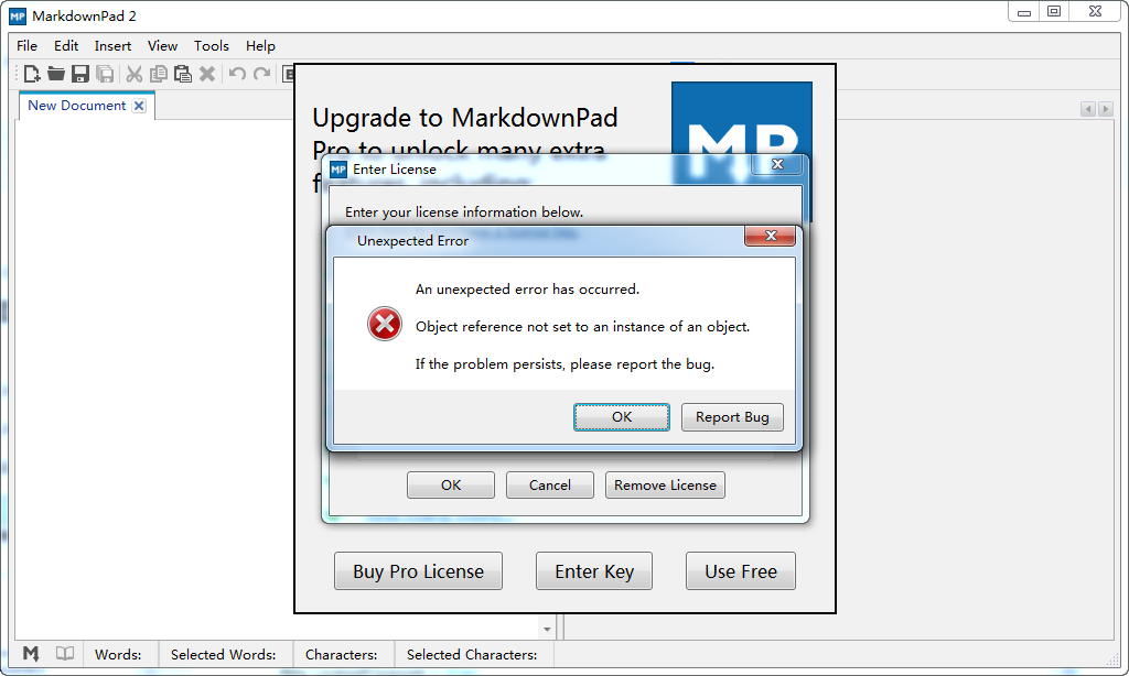 打开MarkdownPad软件,也就是被修改的exe文件。启动时,发现程序弹出窗口报错,如图。