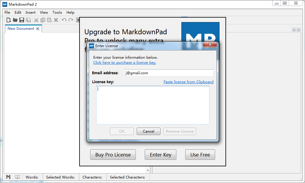 在菜单中选择Help-Upgrade to MarkdownPad Pro,弹出窗口填写邮箱和注册码,发现了一个问题,如果邮箱和注册码有一个为空,OK按钮就无法点击。所以前面修改的代码return true根本没法被执行,所以这个方法无效。
