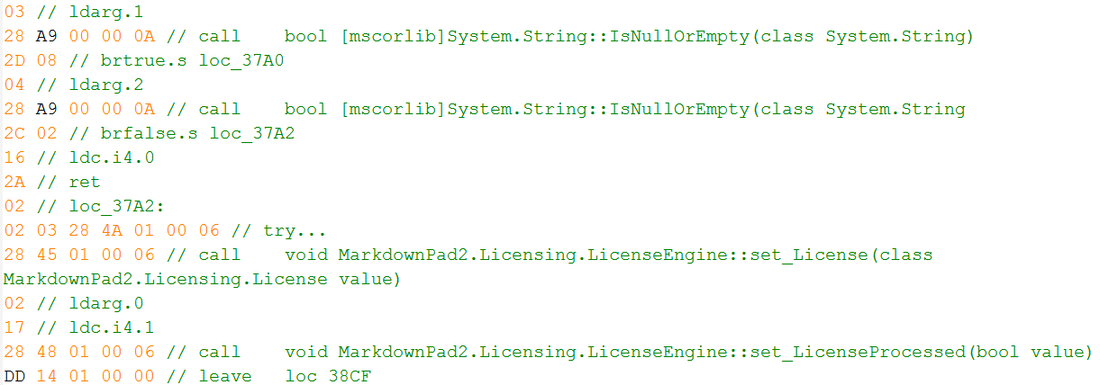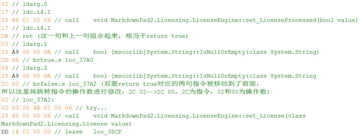 跳转指令brtrue.s loc_37A0对应的十六进制码为2D 08 (04 28 A9 00 00 0A),地址为2FBE~2FBF,查看可发现,loc_37A0对应的16 (2A 02 02 03 28 4A 01)地址是2FC8(刚好中间差8,也就是2D 08中的操作数08)