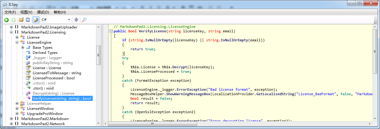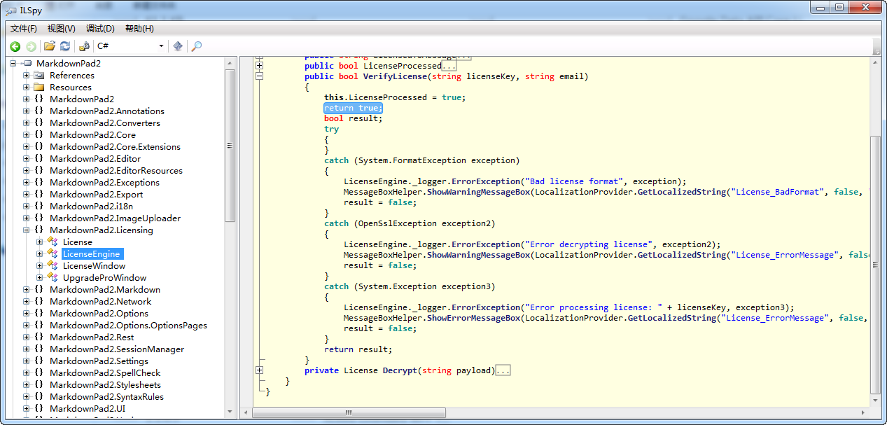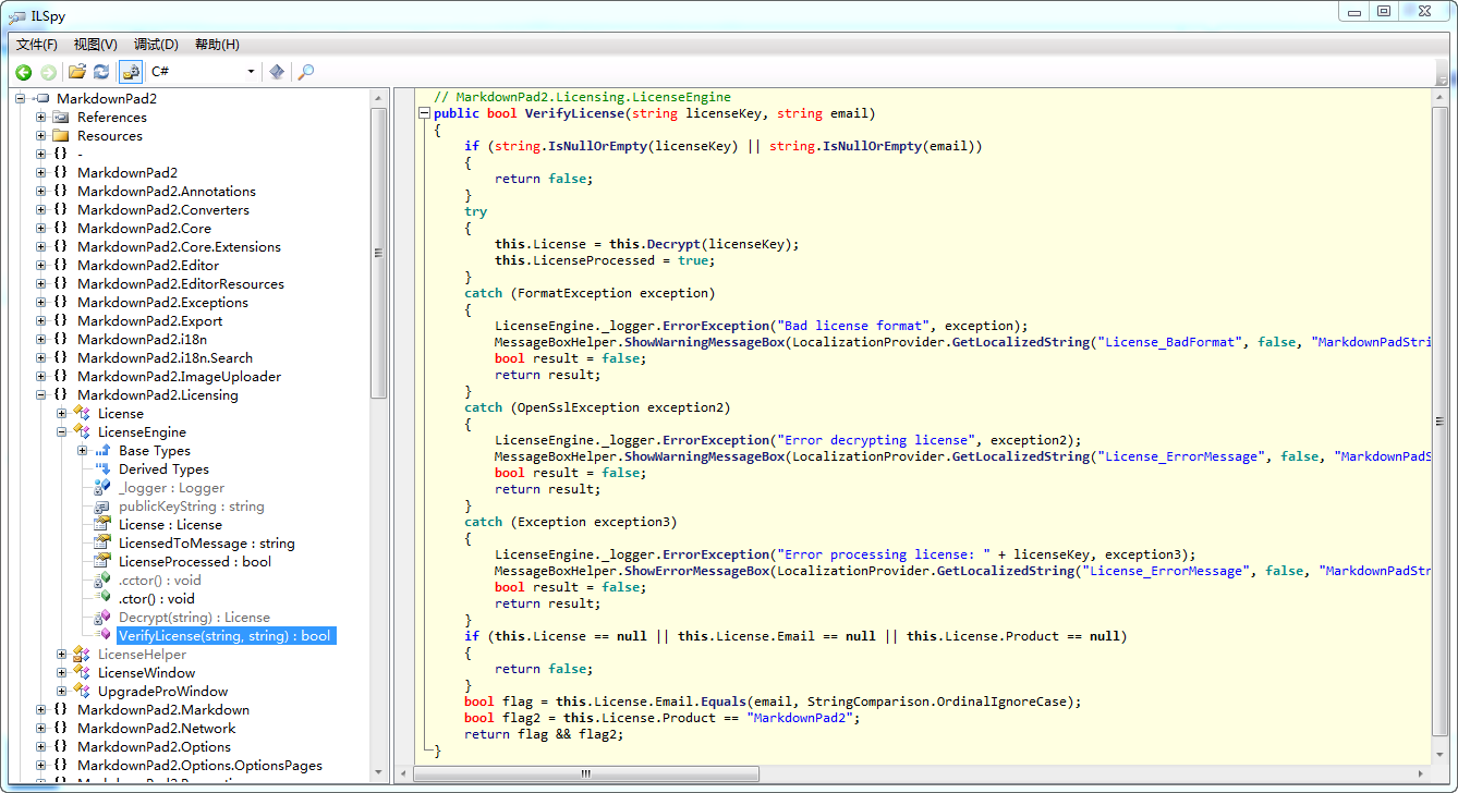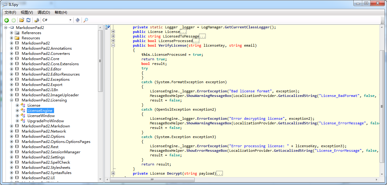 在程序目录中找到MarkdownPad2.exe文件,用ILSpy打开如下图。展开MarkdownPad2.Licensing中的LicenseEngine,可以看到里面的VerifyLicense方法,其参数为licenseKey和email,返回值为布尔型。按照原文中的解释,这个函数用于验证License,验证通过就会返回true;所以只要在这里修改,让其直接返回true即可。但是由于ILSpy中不能直接修改EXE的源码,还需要通过一些工具进行。
