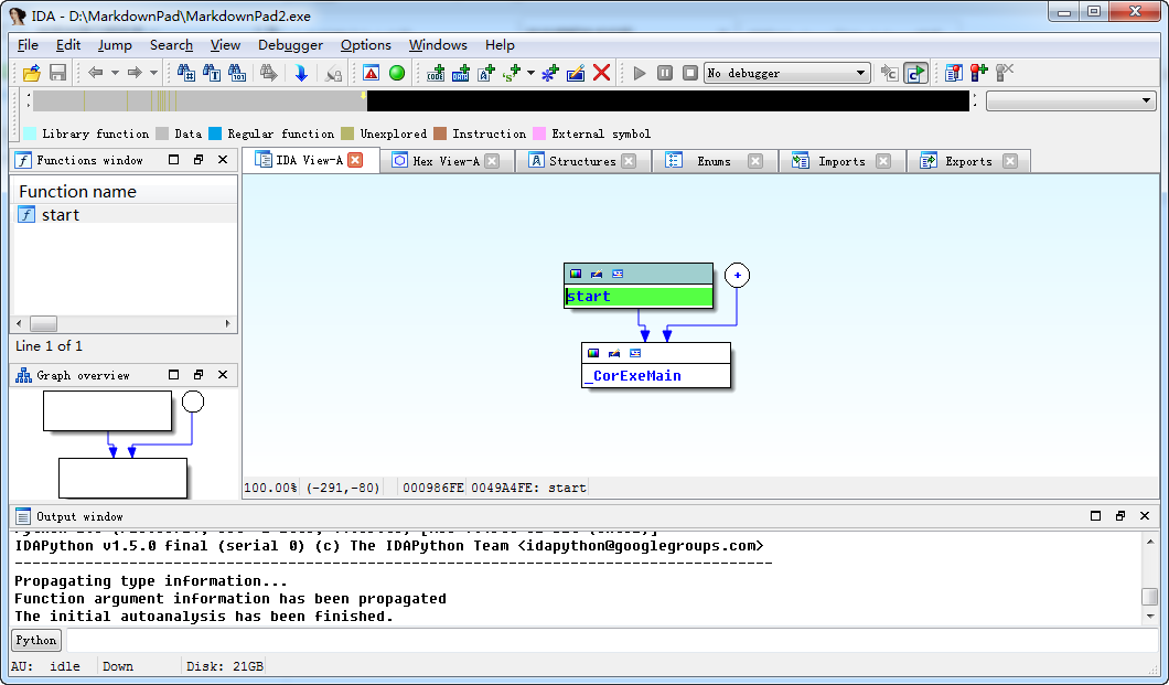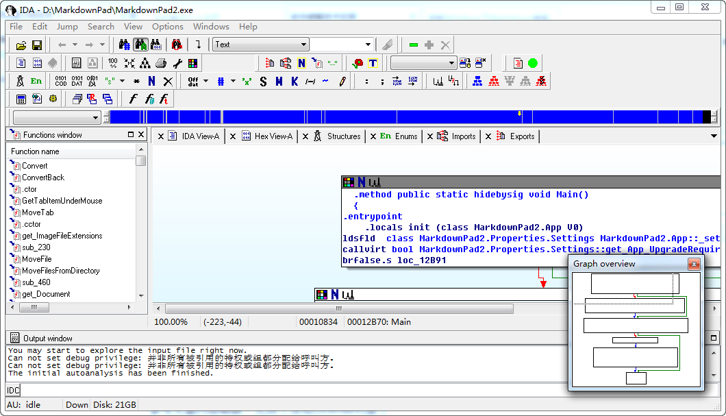 通过标签可以切换不同显示形式。上图中的IDA View-A标签中显示的,是IL指令码的框图,类似于汇编代码。标签Hex View-A中显示的是IL指令码对应的十六进制代码,也就是exe文件中的十六进制编码。
