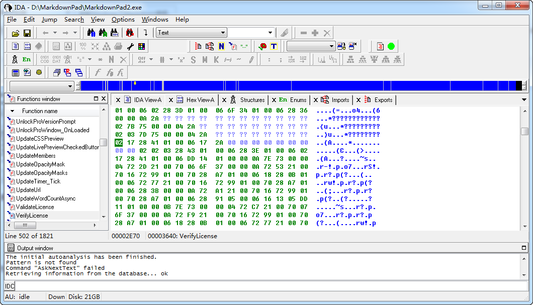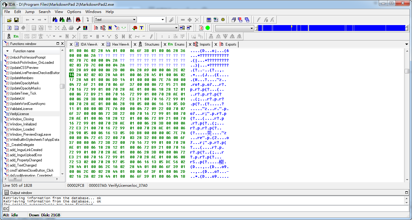 点击Function name,按Alt+T,输入VerifyLicense搜索,找到VerifyLicense函数,双击即可以流程图、十六进制编码等形式显示这个函数。