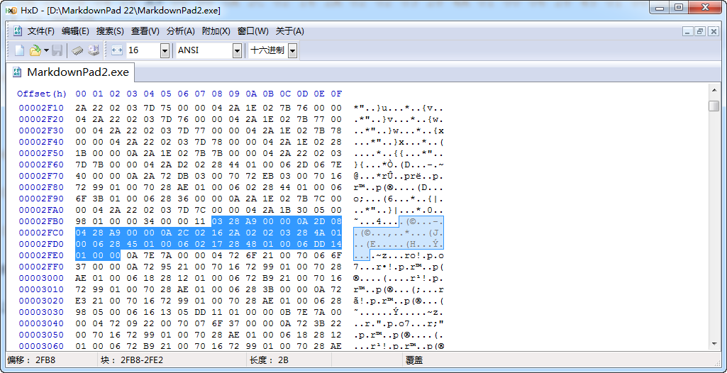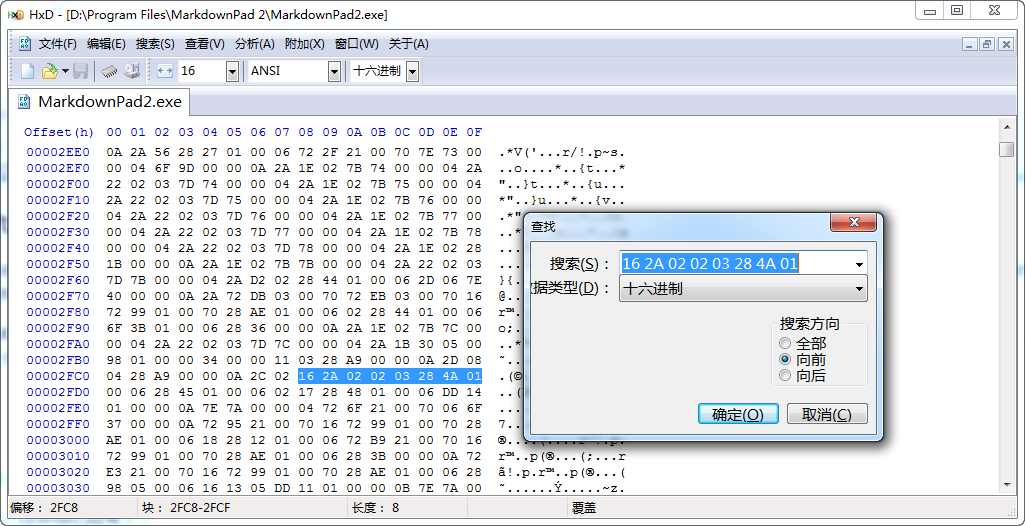 因为十六进制编码里面肯定有很多16,我们需要的是修改特定的16。在IDA中吧我们找到的16和它后面的一段长度合适的十六进制代码复制出来,如“16 2A 02 02 03 28 4A 01”。然后在HxD中进行搜索,从而找到这个特定的“16”。搜索到了要确定这个16是唯一的匹配项,否则可以自行比对,以确定找到的是正确的16。最后将其改成“17”保存。