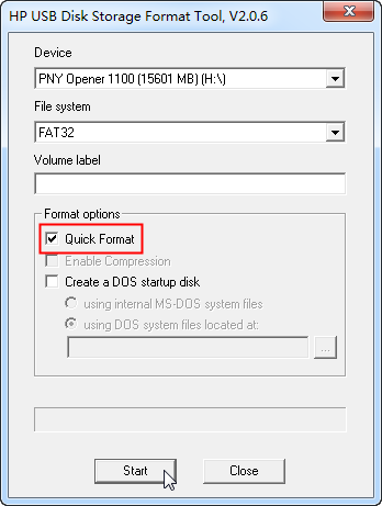 如图选择你的U盘,文件系统选FAT32,勾选Quick Format,点击Start。