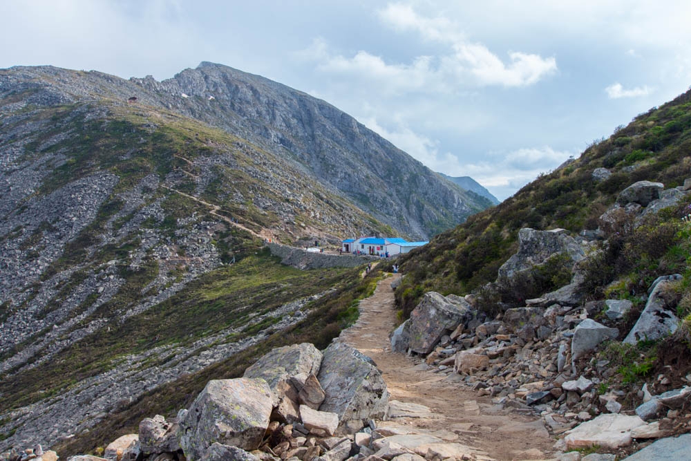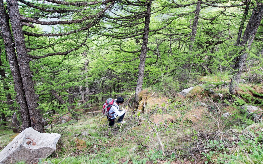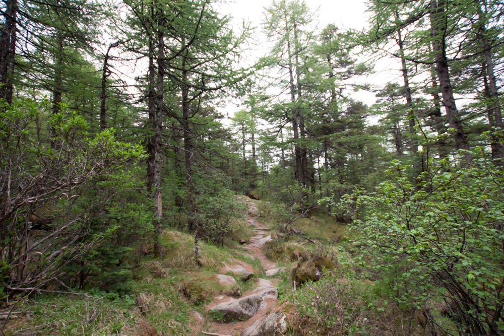 半路上我感觉已经慢慢适应了山上的气压,在图中这种坡度不大的下坡路上,爬山经验还比较多的我,完全可以小跑着奔向目的地了。而三个大一的年轻人高原反应比我和alxia大师轻,已经走到前面很远的地方了,年轻就是任性啊。