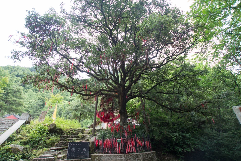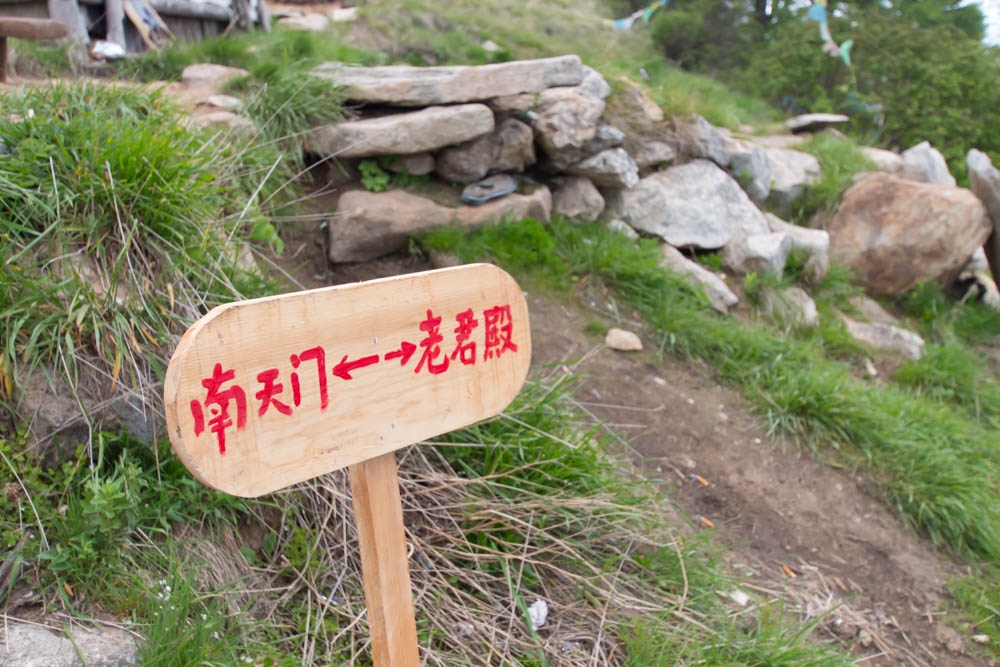 之后的路好走了一点,不再是石海,而是夹杂着乱石的土路。一路上各种路线标记:系在树上的红丝带、画在树上和石头上的红色标记、写着“玉皇池<–>药王殿”的木牌。南线下山全程基本上只有一条很明显的路线,分岔路很少,加上这么多路标,想迷路还真的不容易。