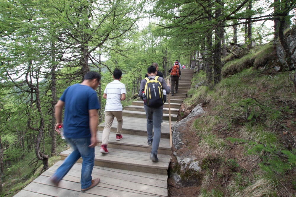 从14:43开始,我们沿着木头的台阶路往上走。刚刚还觉得啥事都没有,现在发现一上台阶就抬不动腿了,走一小段路就会喘气,腿也特别酸;走了几十级台阶感觉和跑了一千米一样,不过只要稍作休息马上就能恢复。高原反应的症状开始了。