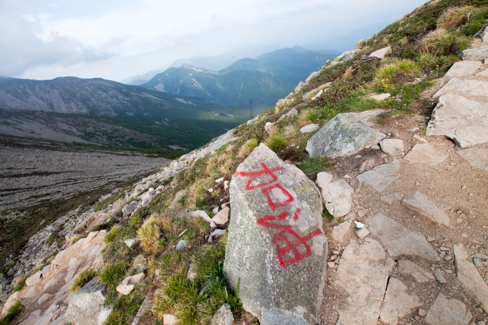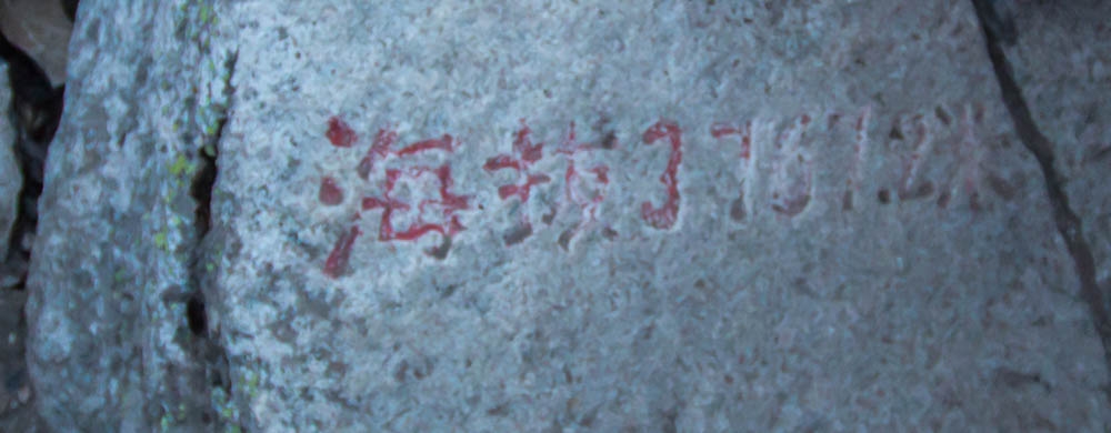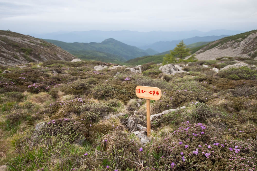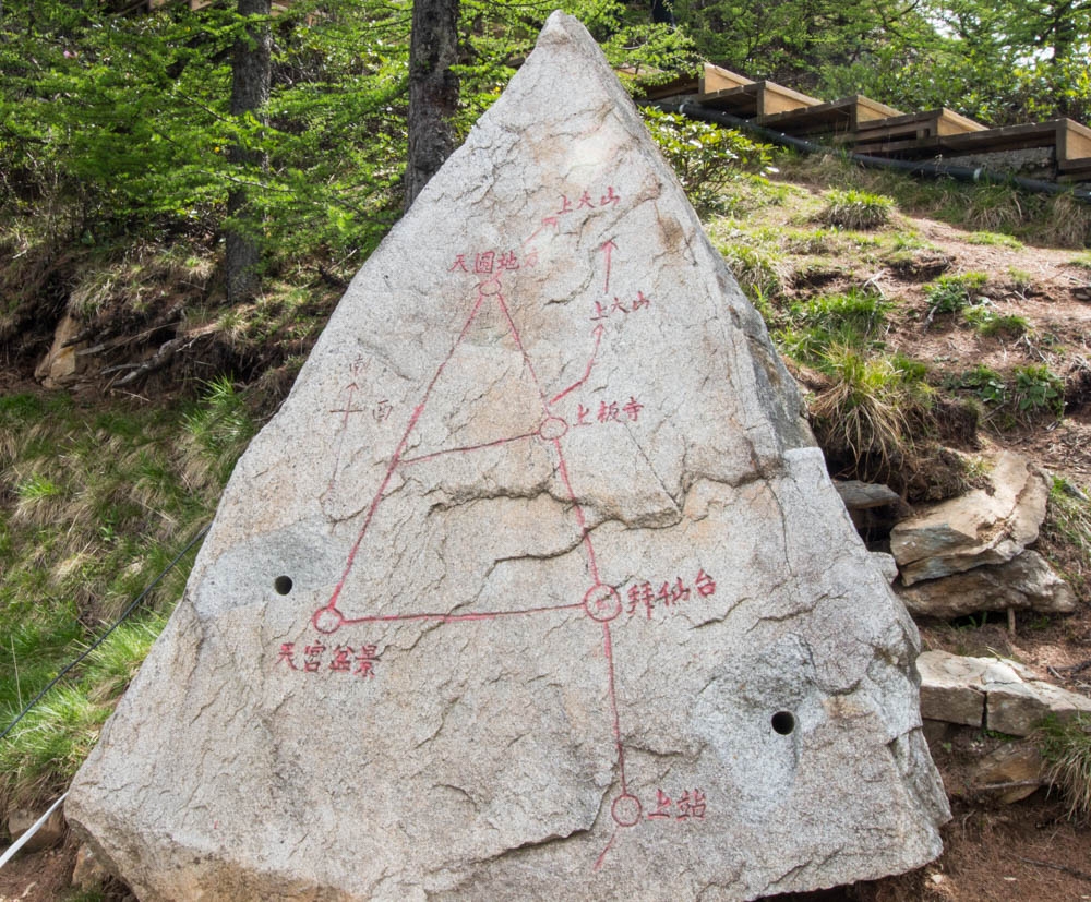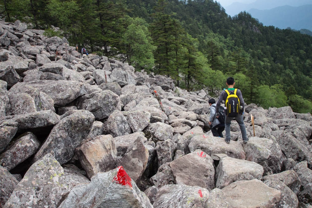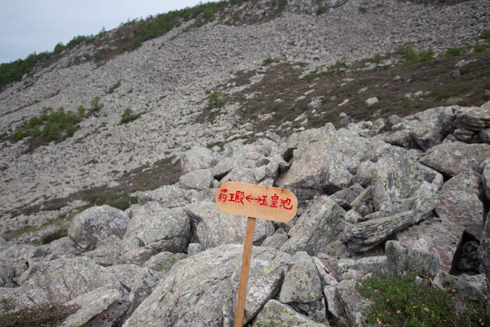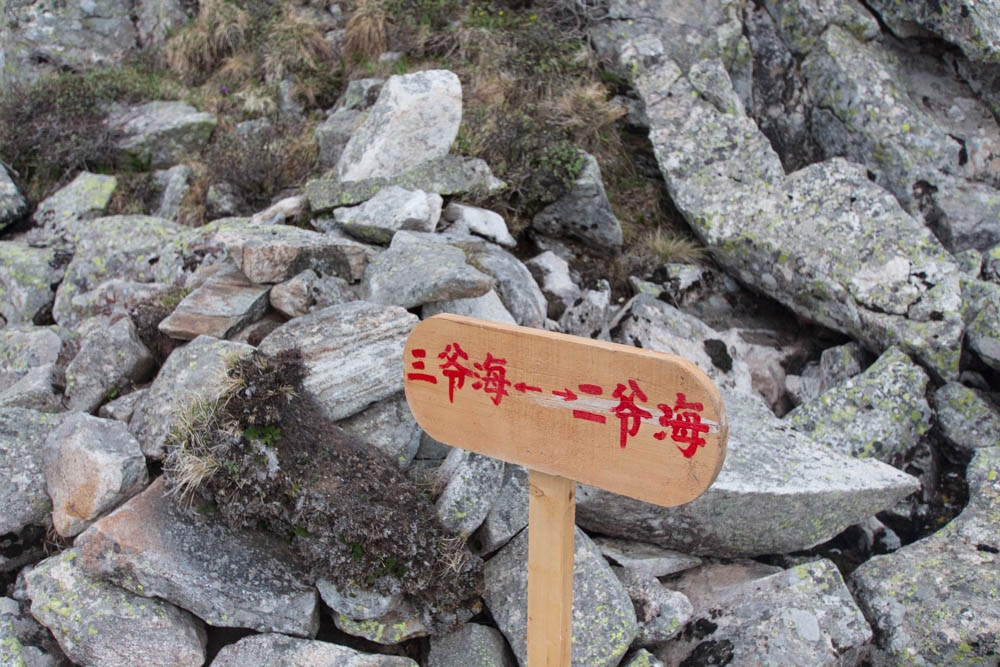 从这条路往上走,已经不像之前那样有很明显修好的路了,很多地方都全是石头。沿途一直能看到前人登山留下的路标,登顶走的就是这条路,每隔一段就会有一个木牌,写着“大爷海<–>二爷海”。满眼的石头,这才是真正的石海。