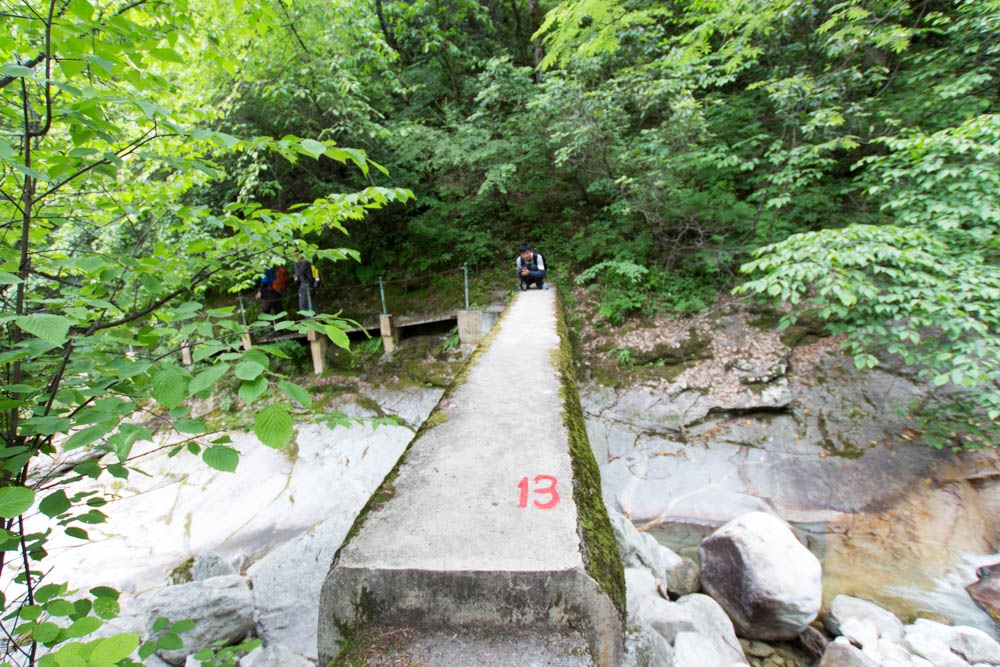 14:15,继续行进,之后的路就简单多了,坡度小了很多,一直沿着河走。中间会穿过很多次桥,图中的桥上标了13,每过一个桥数字减一,过了最后一个桥就快到了。