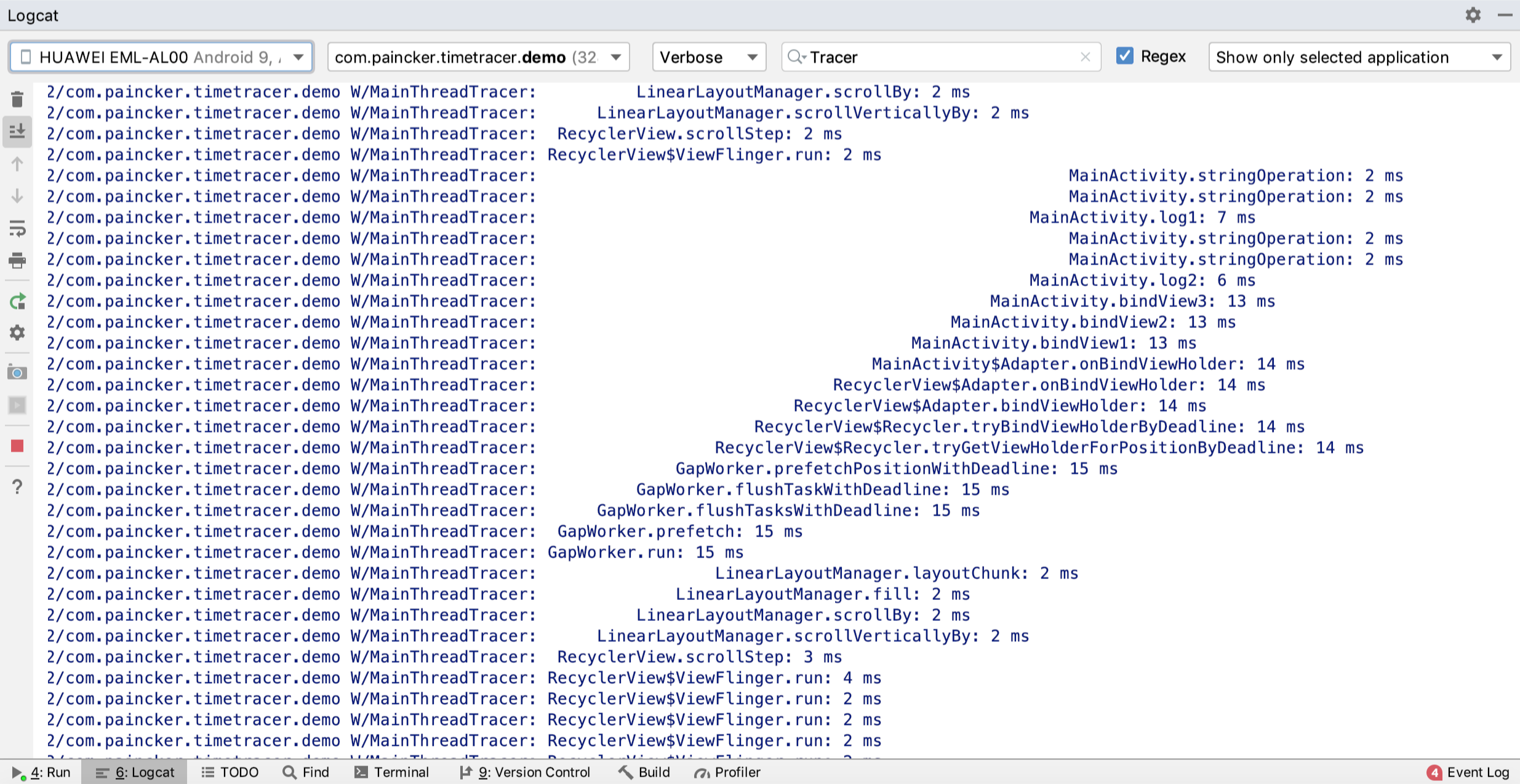 为了定位滑动卡顿的具体代码,在Demo工程中配置使用TimeTracer,追踪方法调用。在Demo工程中执行10s,期间滑动RecyclerView,得出Log信息如图,可以看出方法调用层级和耗时。