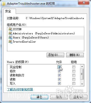选择当前用户名,勾选“允许”下的完全控制,然后点击确定