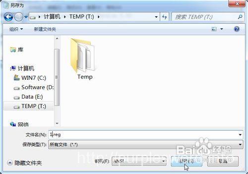 将文件保存为扩展名为reg的文件(注意保存类型中选择所有文件(.),否则会保存成TXT文件)。