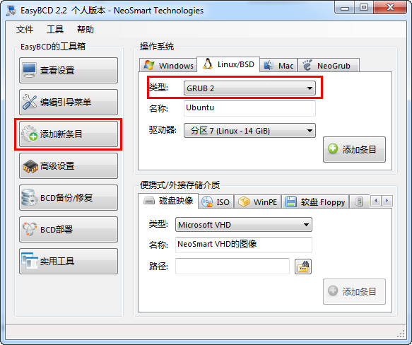 如果用Win7比较多,每次选择会比较麻烦。希望默认进入Windows启动的BootLoader(即开机选择系统的界面,Win7为BootMgr,Ubuntu为grub),可先在Windows或PE下用NTBootAutofix修复Windows的Bootloader,然后用EasyBCD向BootMgr的配置文件BCD中添加Ubuntu的启动项如下: