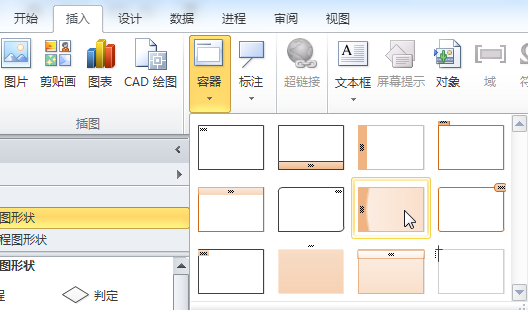菜单-插入-容器,可以插入一个指定样式的容器,容器中可以包含多个形状对象。同样,还可以插入文本框、图标等对象。