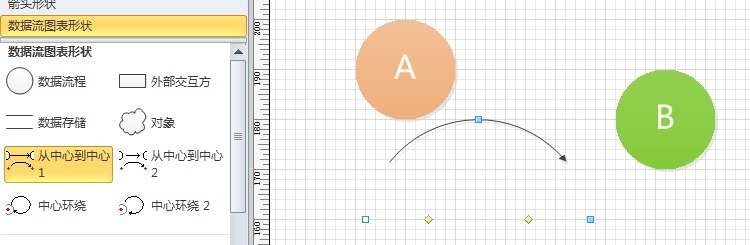 默认的箭头只能沿着横竖两个方向行走。在数据流图中,还可以绘制方向可以任意旋转的直线型箭头,以及环形箭头。可以选择从中心到中心的箭头元素,这个箭头有五个锚点。