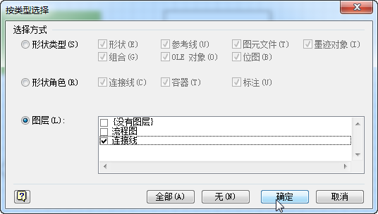 在文档比较复杂的时候,可以使用选择工具选中需要的对象,例如选中文档中所有的箭头,可以使用菜单-开始-选择-按类型选择,图层-连接线,即可。