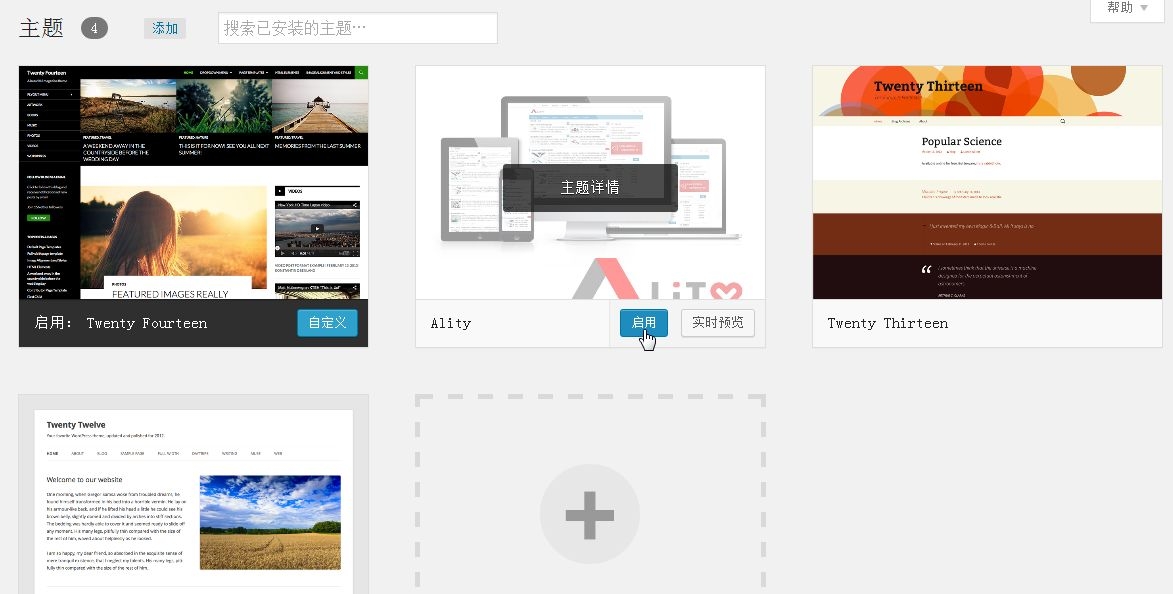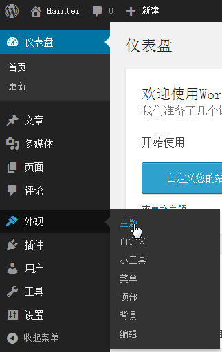 在仪表盘中,我们选择外观-主题菜单,就会打开主题界面,显示所有已经安装的主题。