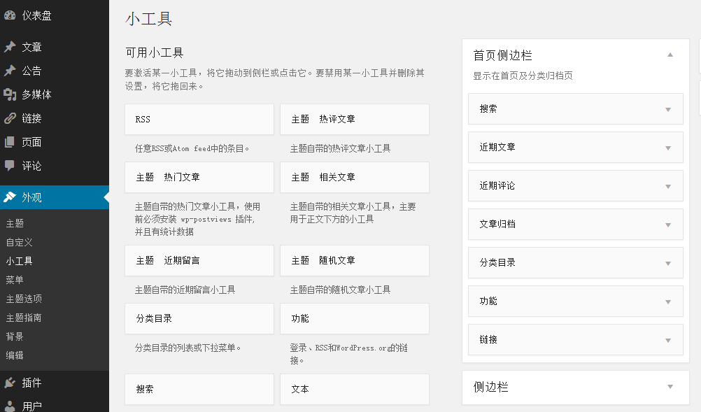 如果你的主题支持小工具,在外观-小工具菜单就能进行设置了。如果你安装了一些插件,例如前面说到WP-PostViews,他也会生成一个小工具供你使用。还有些主题也带有很多小工具。
