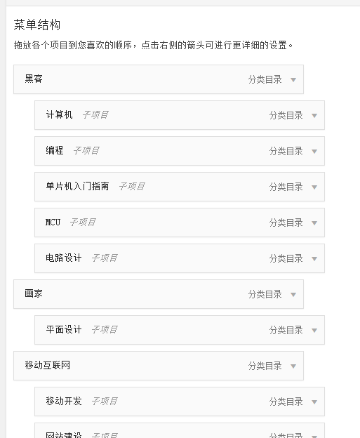 你可以设置首页、关于和留言板的页面在菜单上,然后把文章分类也放在菜单里。支持多级菜单,直接在页面中拖动位置就能进行设置。