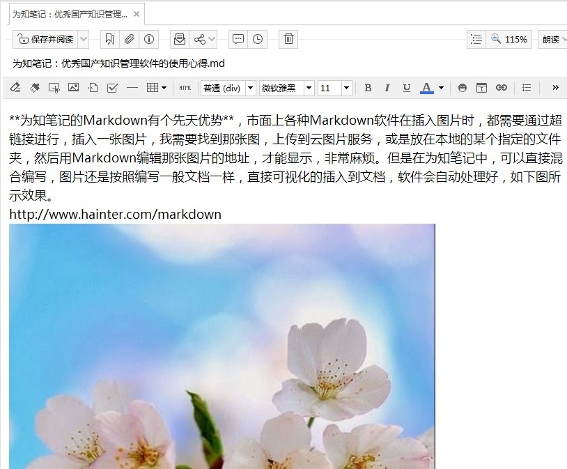 为知笔记的Markdown有个先天优势,市面上各种Markdown软件在插入图片时,都需要通过超链接进行,插入一张图片,我需要找到那张图,上传到云图片服务,或是放在本地的某个指定的文件夹,然后编辑Markdown输入那张图片的地址,才能显示,还得考虑图片保存位置、文件名等问题,非常麻烦。但是在为知笔记中,可以直接混合编写,图片还是按照编写一般文档一样,直接可视化的插入到文档,直接用自带的截图、从电脑中拖拽进去、复制粘贴等都可以,软件会自动处理好图片,如下图所示效果,什么都不用考虑。